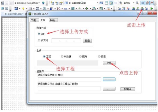 2. 軟件點擊”上傳“,設置通訊方式,選擇上傳工程,點擊上傳按鈕